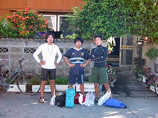 | 民宿「宝吉」の前にて。この時点で雲なし快晴 | 古仁屋の港はカヤックでいっぱい |