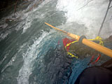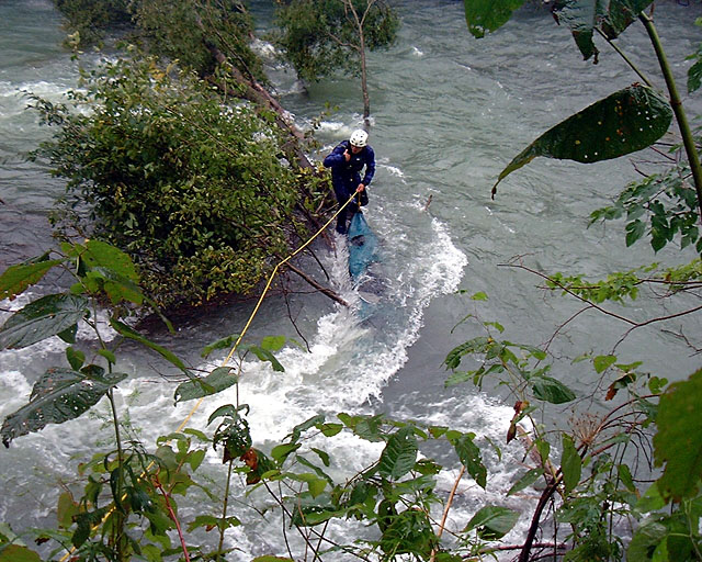 TOM さんのスタッフに回収作業をしていただいているの図。 下流部からエントリーして濁流を泳ぎ切る。信じられないぐらいの泳力とテクニック。 左岸・崖の上の立木をアンカーにして、3つの滑車と牽引用ロープでバウ側から引き揚げる。 |
