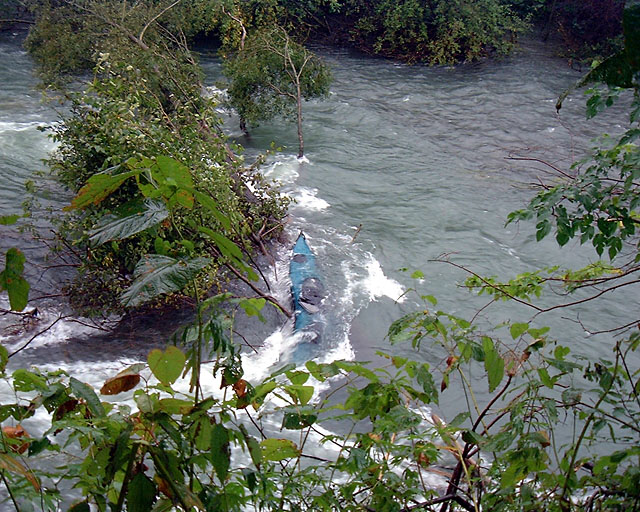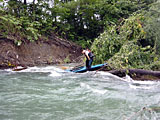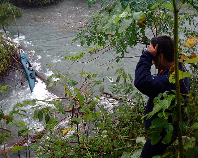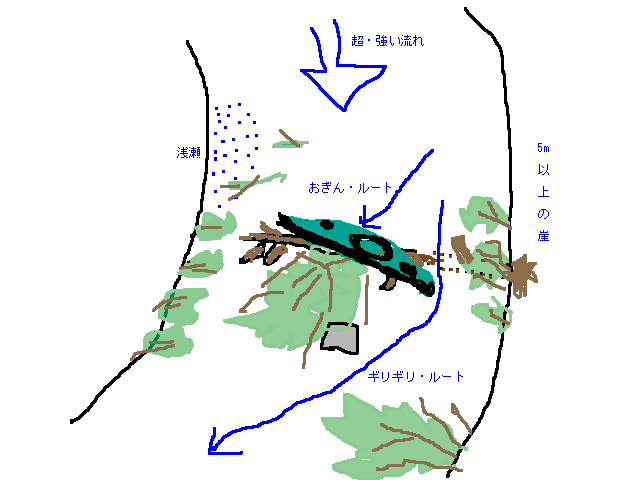 現場見取り図 川幅は約 15m 大きな倒木が横向きに川に横たわっているのを発見。しかも流れが速いため、直前で停止は不可能。 通れそうな隙間は左寄りの一箇所のみ。先行する森山艇は辛くもクリア。 そこにしゃり君艇と併走した状態で突入。 隙間を譲るカタチになって、倒木の上に乗ってしまい、人間は脱艇したものの、フネは張り付いた。 流芯にはテトラがあり、倒木はガッチリと引っかかっている。 右岸・左岸共に飛び越せない隙間があり、岸からのアプローチは泳ぐしかない。(非常に危険) 同日我々の前を下っていた ALLEY の2人組が居たのだが、後で聞いたところ、 倒木発見後、右岸の浅瀬ギリギリまでバックフェリーで寄せ、枝を折りつつ脱出したとのこと。偉い。 |