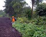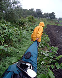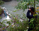 翌朝 (2003.09.10)、10 時ころ。 屈足の TOM さんにレスキューを依頼。 雨の中、左岸側から現状偵察の図 しゃり君が GPS で位置を記録してくれていたため、場所の特定は楽だった。 |