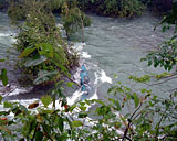 その右岸側の水流。 最終的に、この奥に飛び込んで人間は脱出。 (実は飛び込む際に足を滑らせて、ちょっとヤバかった。) 100m 以上流されないと上陸できそうな瀞場はない。 |