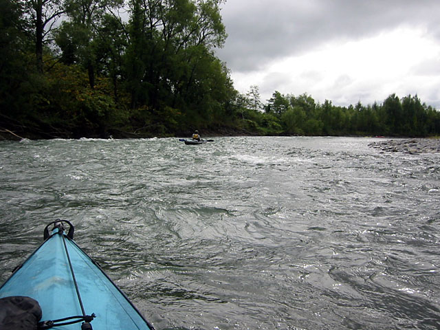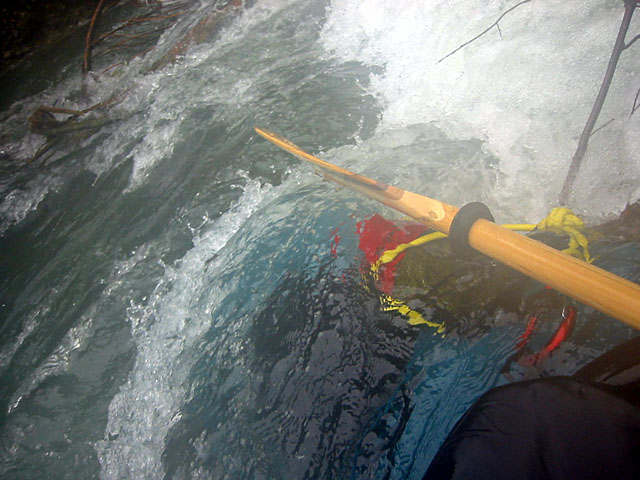 スターン部の水没の図。 この直後、右岸側の浅瀬から投げてもらったスローロープで荷物だけ回収してもらう。 |