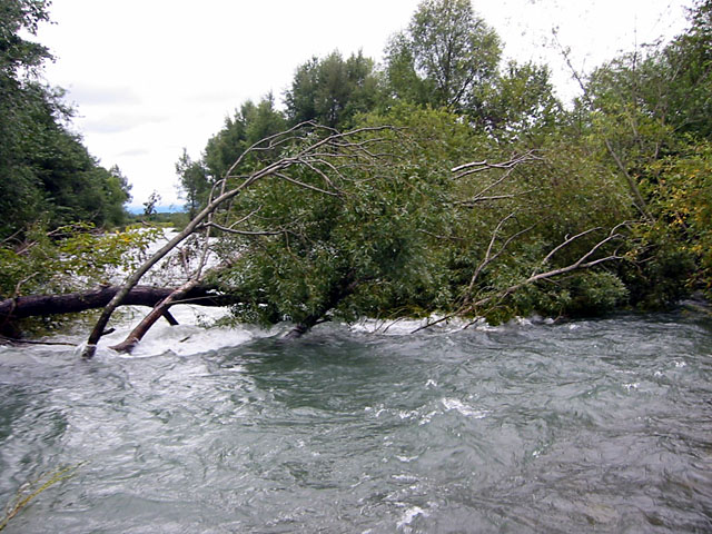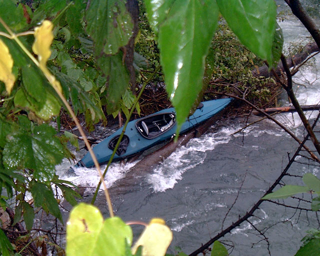 まだ張り付いていた。 昨日に比べ、水量はずいぶん減っていて、フネの全体が見える。 スターンがやや下流側に向きを変えていた。 この水量ならば脱出できそうだが、倒木が露出したため、フネで倒木を越えるルートがなくなっている。 |
