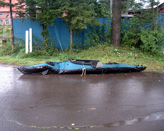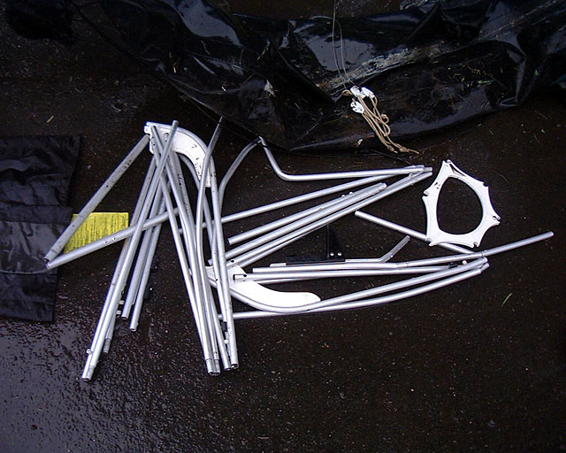 フレームをバラしてみた。 ジョイント部はほぼ全損なものの、紛失したのは右ペダル部のフレームのみだった。 コーミングや船体布は奇跡的に無事。 |