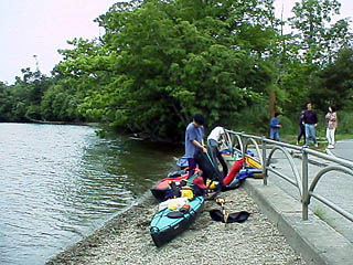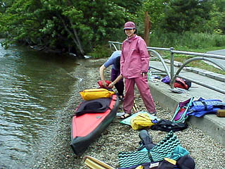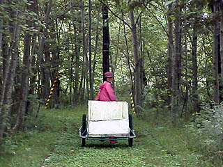 キャンプ場のリアカーを借りて、 フネと装備一式を半島の風下側に運ぶ |