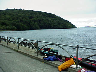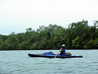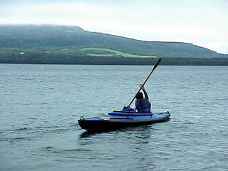 屈斜路湖を漕ぐの図 半島の風下から出るとすごいウネリ 海を漕いでるようだった 結局、今日は蝶湖橋までとした 左舷から風を受け、左ばかり漕いだので、肩がこった |